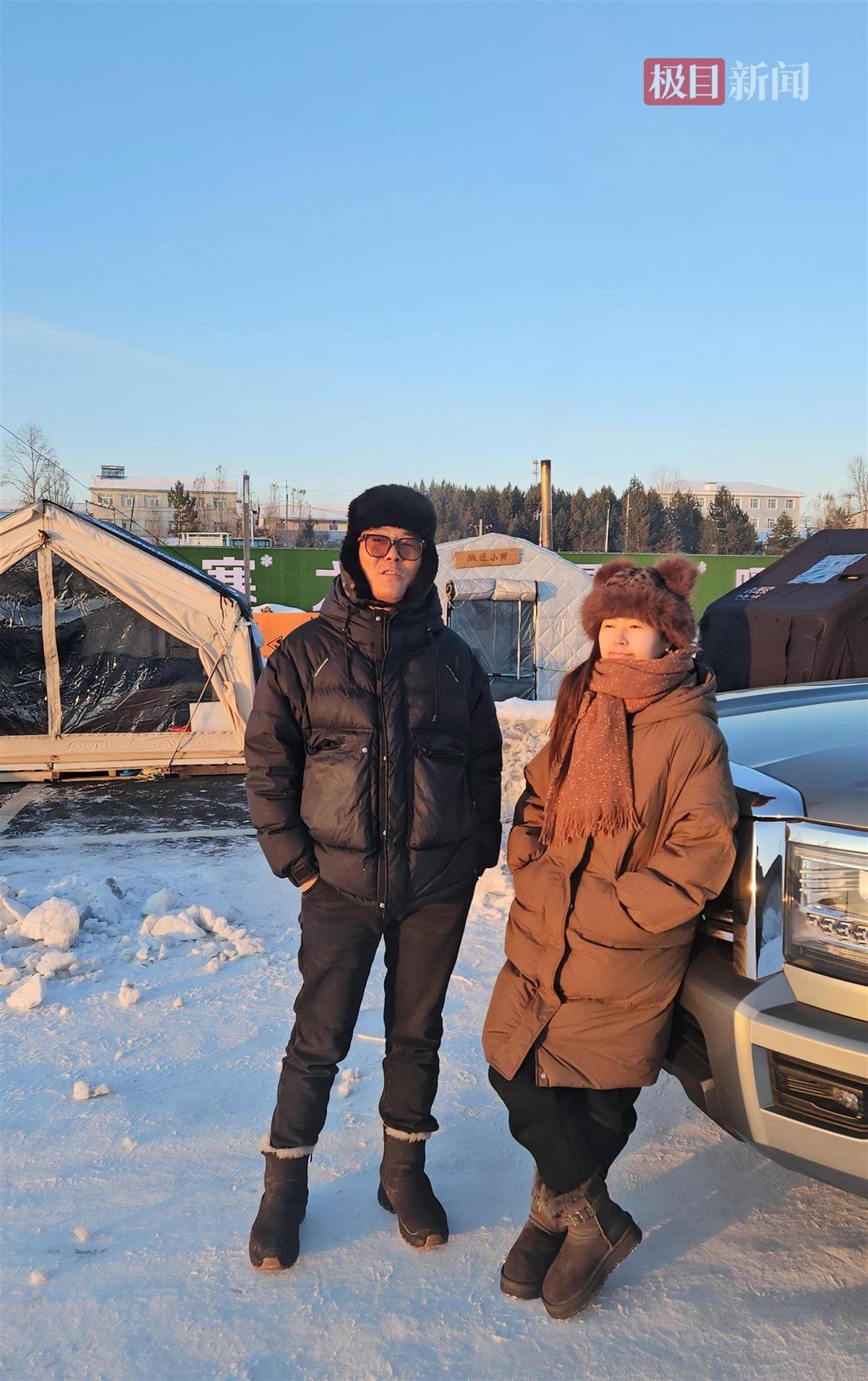 在营地造访时,极目新闻记者看到不少自媒体博主正在进行直播,他们一边在自己建立的帐子前走动,一边和谈论区网友互动,招引更多网友重视。其间,正在收拾新帐子的男人老顾告知极目新闻记者,他和妻子康康是一对自驾游博主,运营着名为“背叛配偶”的视频账号,两人均为80后,来自陕西渭南。本年9月,“背叛配偶”夫妻驾驭SUV来到黑龙江漠河市桥北自驾营地,在此搭帐子露营敞开极寒应战。
