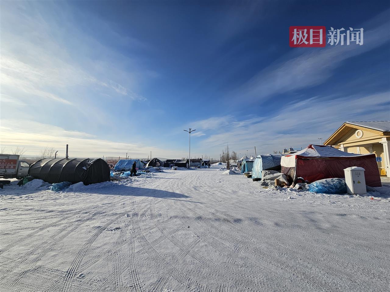 8日上午,极目新闻记者实地看望漠河市桥北自驾营地,看到一片平坦的雪地上建立了十多顶色彩各异、巨细不同的帐子,部分帐子内安装了柴火炉取暖。记者发现,一旁公共卫生间外的墙壁上挂着电子屏,实时显现着气候、室外温度、空气指数等数据信息。
